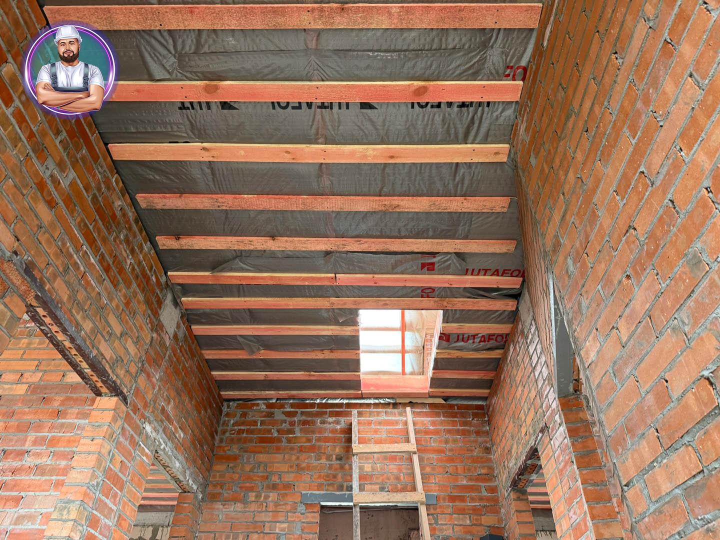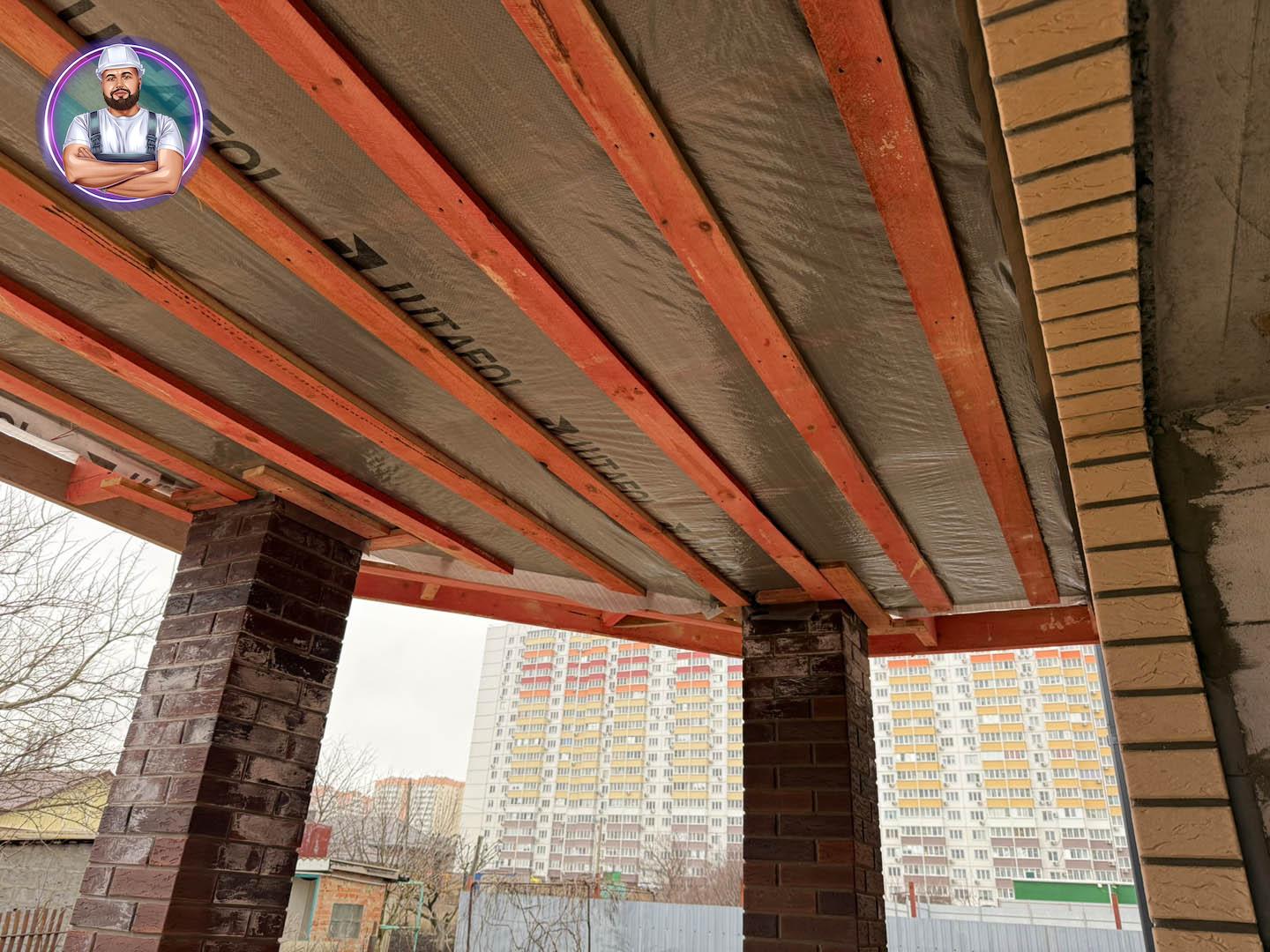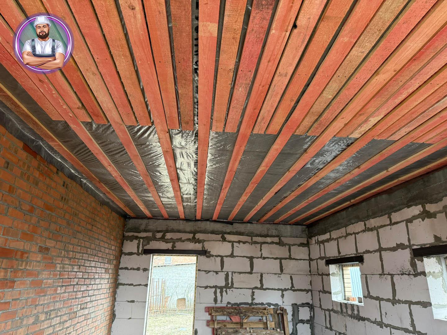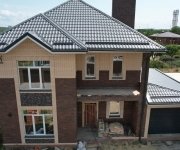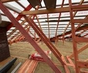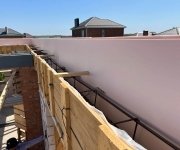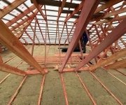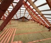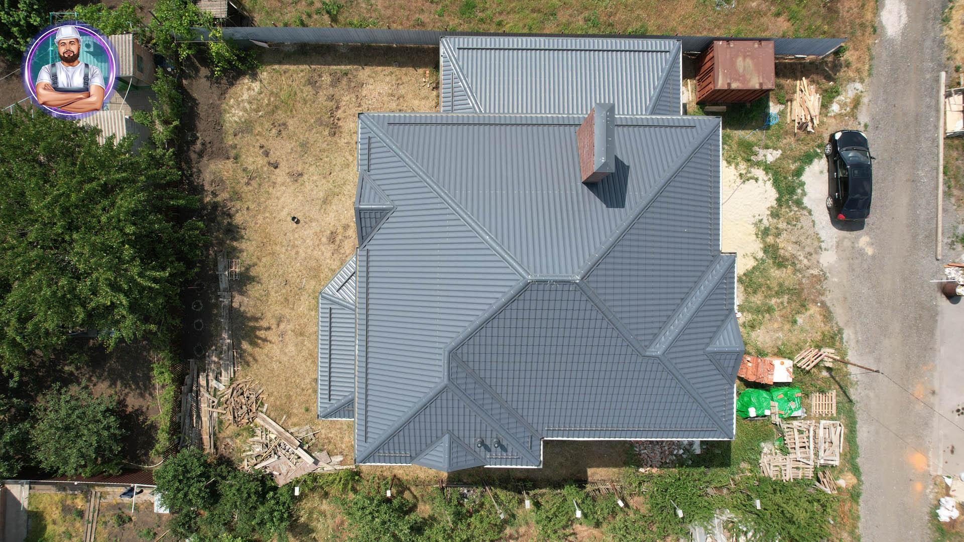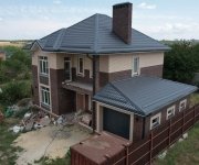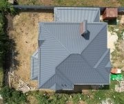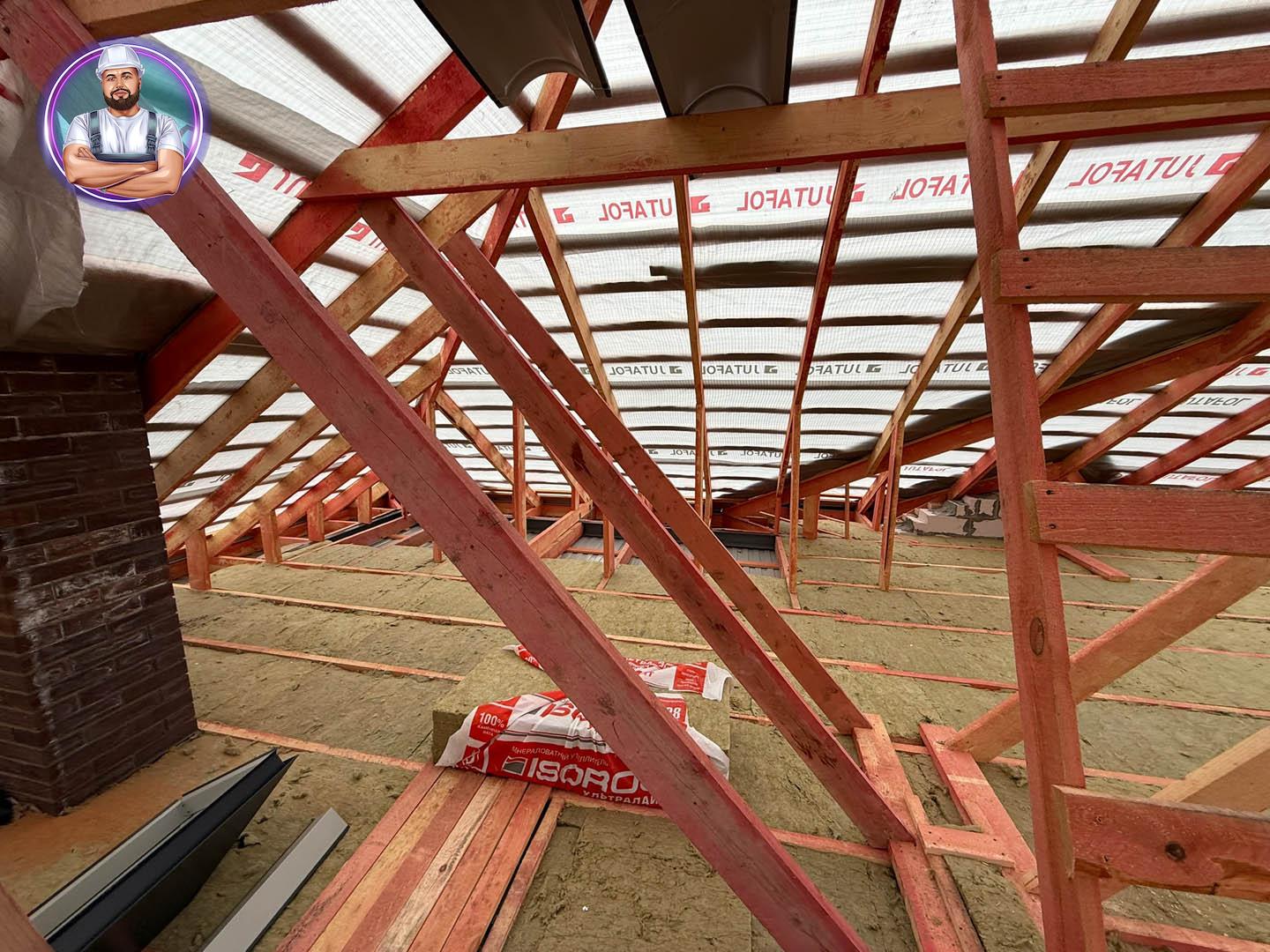 Кровля: стропильная система утеплена минераловатой толщиной 200 мм, уложена гидро- и пароизоляция. Покрытие — металлочерепица «Супермонтеррей» 0,5 мм (тёмно-серый цвет RAL 7024). Установлена система водостоков и снегозадержателей.